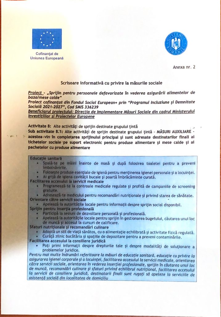 • ANUNȚ PROIECT SPRIJIN PENTRU PERSOANELE DEFAVORIZATE ÎN VEDEREA ASIGURĂRII ALIMENTELOR DE BAZĂ